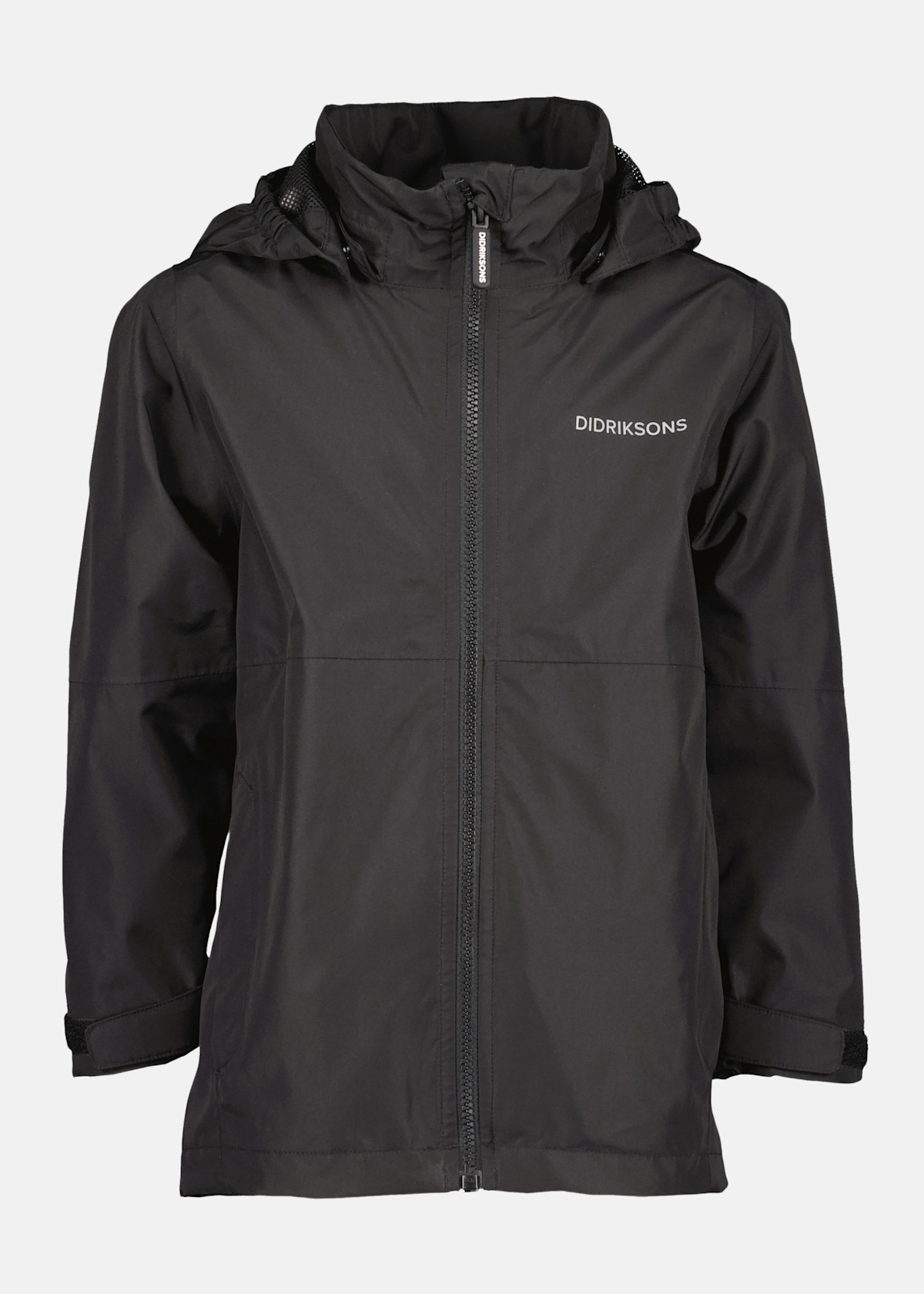 Äventyr i alla väder med en vind- och vattentät jacka från Didriksons! . Vattenpelare: 10.000 mm . Andningsförmåga: 5.000 g/m2/24h . Vind- och vattentätt material . Hög krage . Avtagbar huva . Kardborrband vid ärmsluten . Två sidofickor med dragkedja . Reflekterande logga Förbered ditt barn för alla sorters väder med denna vind- och vattentäta jacka från Didriksons! Den är försedd med en hög krage och en avtagbar huva för extra skydd vid behov. Jackan erbjuder även praktiska detaljer som justerbara ärmslut och handfickor med dragkedja för att förvara små fynd. Den perfekta jackan för små äventyrare!Material: 100% polyester. Skontvätt 40°C.